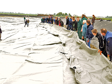 Ruim zestig boeren hebben woensdagochtend meegeholpen bij het installeren van een grote mestzak bij het bedrijf van melkveehouder Ate Kuipers in Den Ham. Het is een gigantische zak met een afmeting van ruim 55 bij 33 meter. Daar kan 5000 kubieke meter mest in worden verzameld.